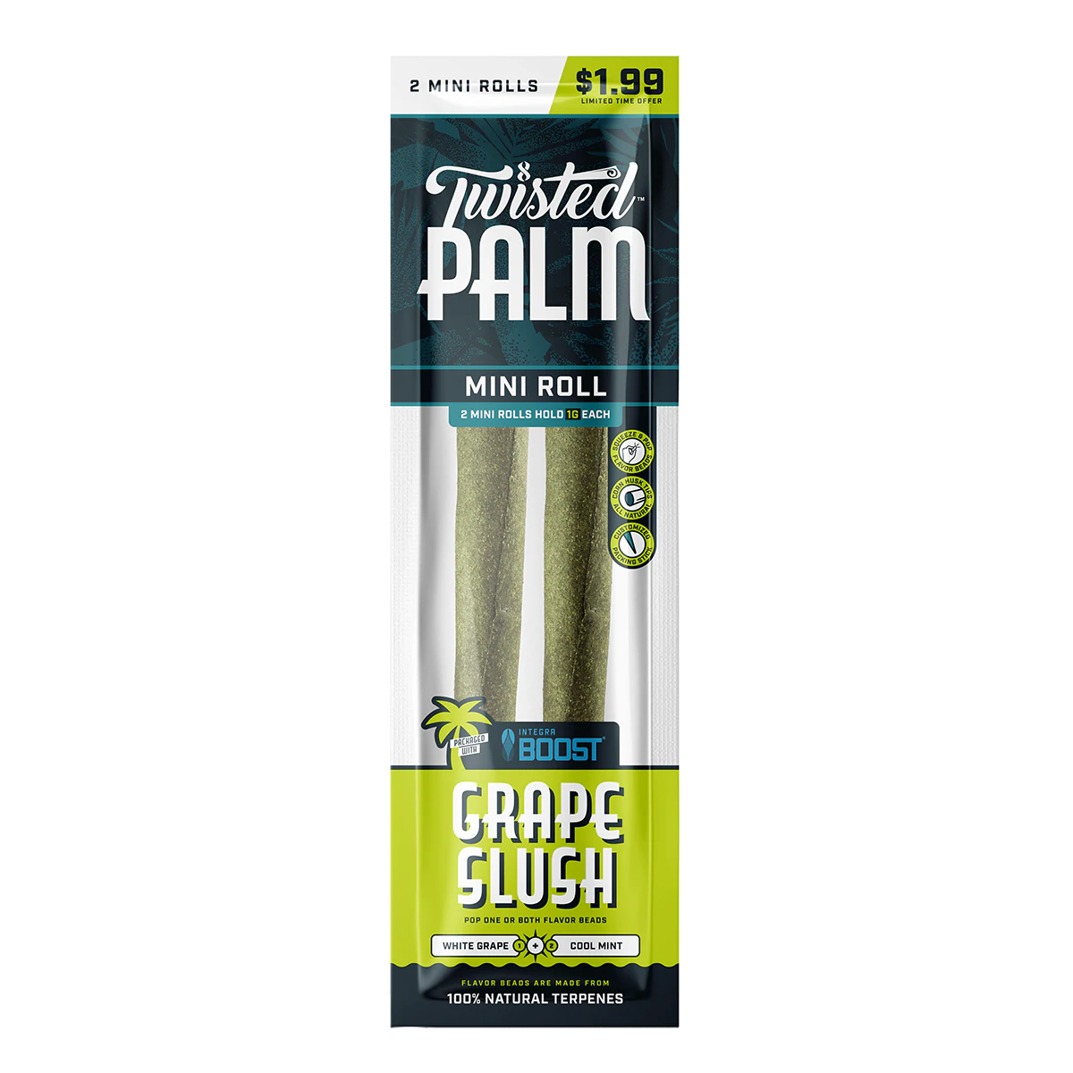 Twisted Wraps has always been one of the top selling brands on the market & always bringing the highest of quality products to the market. The new Twisted Palm is made from all Natural & Tobacco Free Palm Leaf Rolls with 100% Natural Terpene flavoring. Squeeze & Pop Corn Husk Filter with the most tasty flavor combos you will come across! Comes with Integra Boost Humidity pack to insure a long shelf life & a fresh roll!